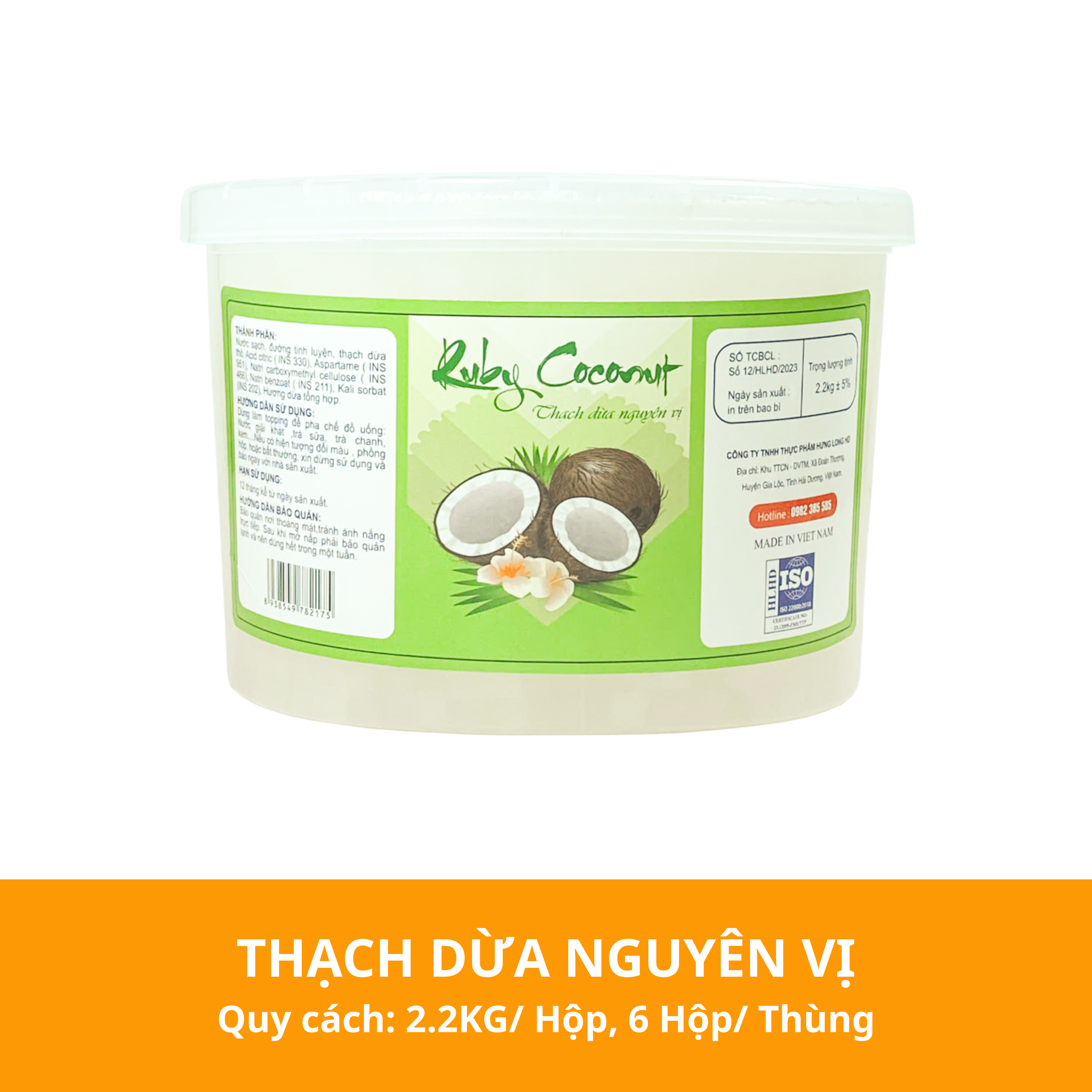 - Thành phần: Nước sạch, Đường tinh luyện, Thạch dừa thô, Acid citric (INS 330), Aspartame (INS 951), Natri carboxymethyl cellulose (INS 466), Natri benzoat (INS 211), Kali sorbat (INS 202), Hương dừa tổng hợp.