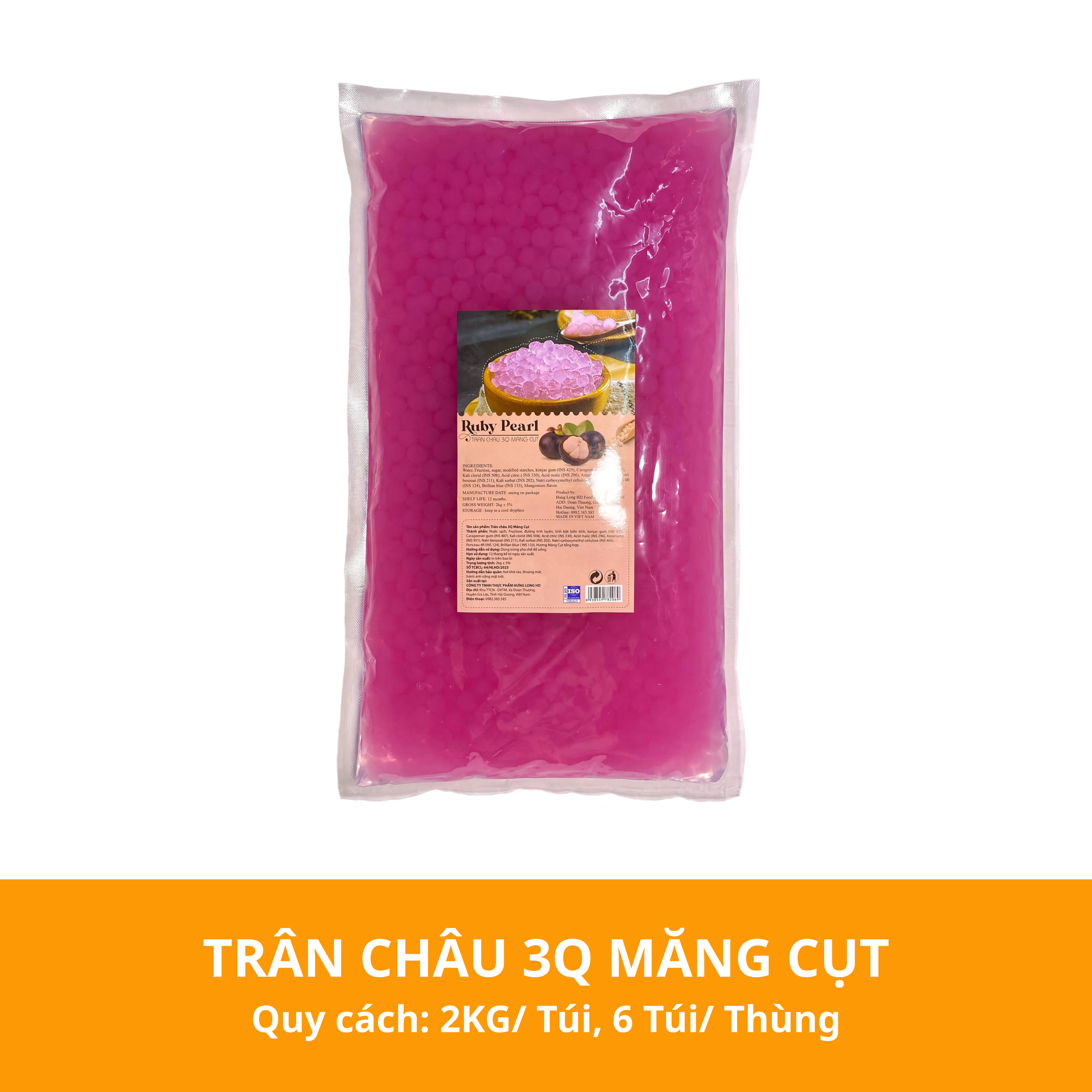 - Thành phần: Nước sạch, Đường tinh luyện, Tinh bột biến tính, Bột konjac (INS 425), Carrageenan (INS 407), Kali clorid (INS 508), Acid citric (INS 330), Acid malic (INS 296), Aspartame (INS 951), Natri benzoat (INS 211), Kali sorbat (INS 202), Natri carboxymethyl cellulose (INS 466), Ponceau 4R (INS 124), Brillian blue (INS 133), Hương măng cụt tổng hợp.