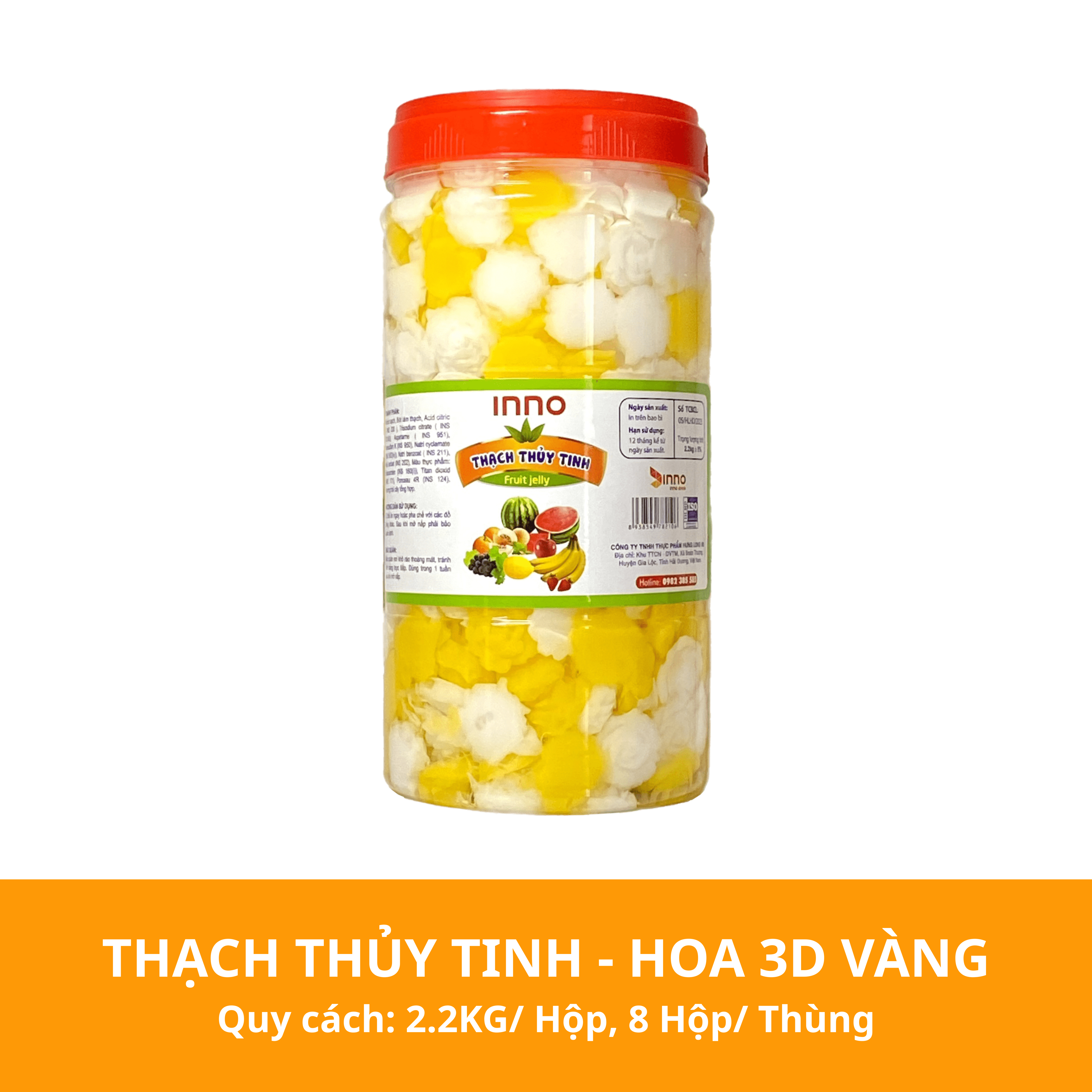 - Thành phần: Nước sạch, Bột làm thạch, Acid citric (INS330), Trisodium citrate (INS 331(iii)), Aspartame (INS 951), Asesulfam K (INS 950), Natri cyclamate (INS 952(iv)), Chất bảo quản: Natri benzoat (INS 211), Kali sorbat (INS 202), Màu thực phẩm: Betacaroten (INS 160(i)), Titan dioxid (INS 171), Ponceau 4R (INS 124), Hương trái cây tổng hợp.