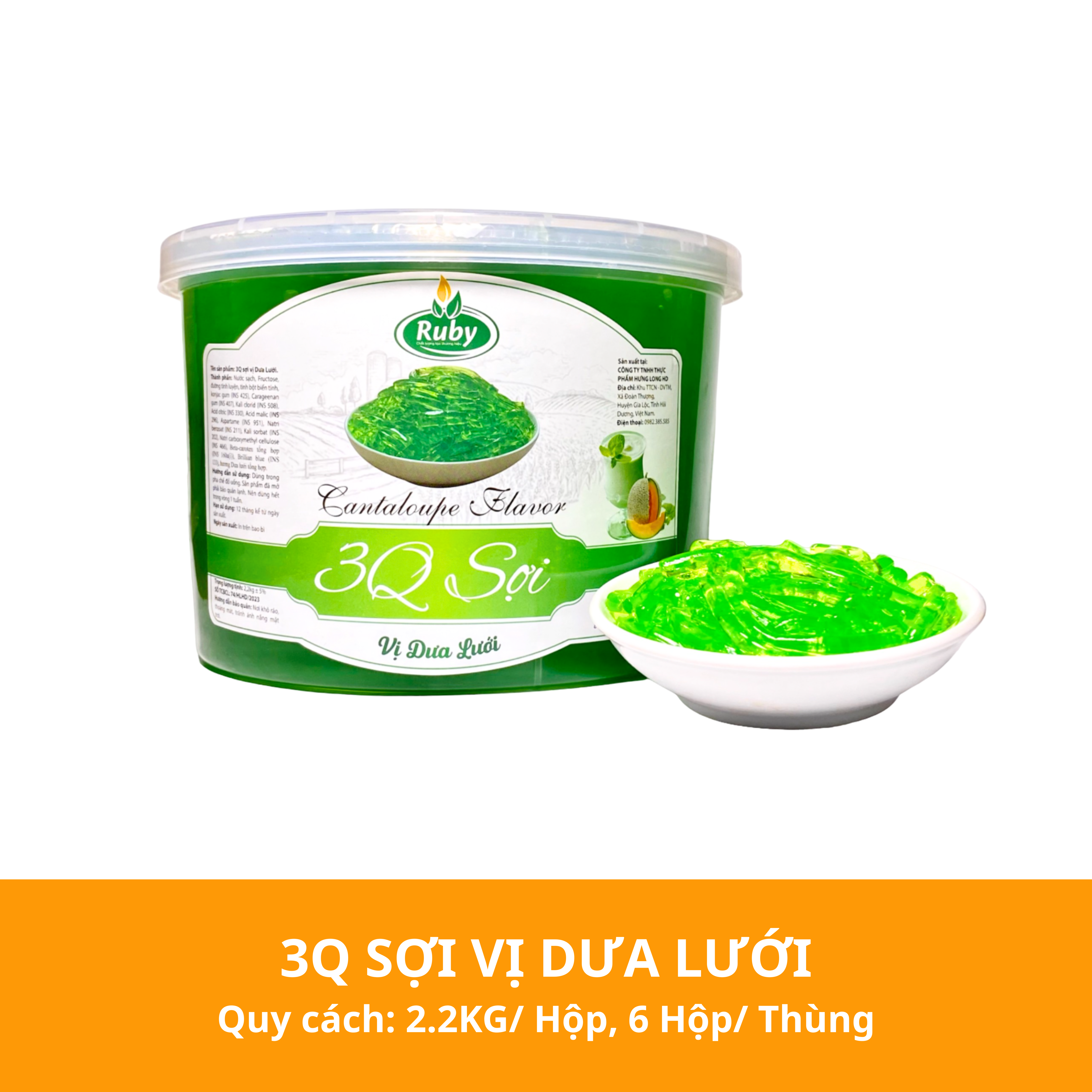 - Thành phần: Nước sạch; Đường tinh luyện; Tinh bột biến tính, Konjac gum ( INS 425), Carrageenan(INS 407); Kali clorid ( INS 508), Acid citric (INS 330), Acid malic (INS 296), Aspartame ( INS 951); Natri benzoat ( INS 211), Kali sorbat (INS 202), Natri carboxymethyl cellulose ( INS 466); Beta-caroten tổng hợp ( INS 160a(i)), Brillian blue (INS 133); Hương dưa lưới tổng hợp.